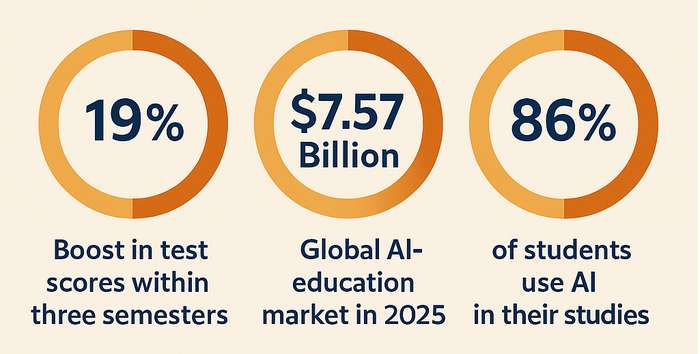 AI in classrooms boosts test scores by 19% within three semesters, and students using AI learning tools outperform peers by an average of 12.4%. The global AI‑education market is projected to hit $7.57 billion in 2025. Also, 86% of students now use AI in their studies, and over half use it at least once a week.
