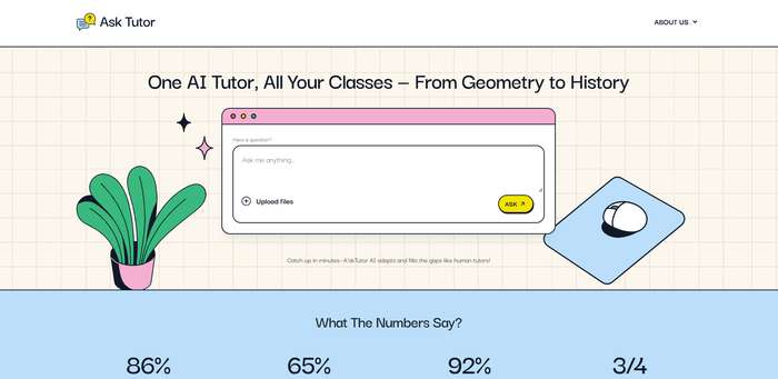 Asktutor helps when a student cannot solve a problem. The tool fits the level of each learner, from basic sums to calculus. It breaks tough topics into easy steps and adapts to how you study. You can upload files (txt, pdf, doc, png, jpeg, jpg) to ask questions, up to 10,000 characters or 32MB in size. Students can use the Asktutor anytime and get an answer. This tutor AI also gives practice tasks and step-by-step help. With AI-powered assistance, learners fix mistakes faster and keep improving with steady progress.