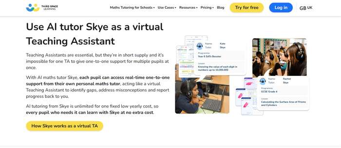 Skye is cost-effective. In the UK, it starts at £3,500 per year for a small primary school. In the US, prices range from $5,000 to $15,000 per year depending on school size. These fixed plans cover unlimited students and tutoring sessions. Schools save up to 90% compared with traditional private tutoring.