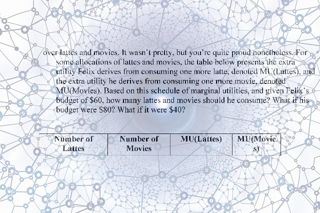 b. You try very hard to elicit Felix’s preferences. After hours of probing questions, you find that you can construct a schedule of his marginal utilities over lattes and movies. It wasn’t pretty, but you’re quite proud nonetheless. For some allocations of lattes and movies, the table below presents the extra utility Felix derives from consuming one more latte, denoted MU(Lattes), and the extra utility he derives from consuming one more movie, denoted MU(Movies). Based on this schedule of marginal utilities, and given Felix’s budget of $60, how many lattes and movies should he consume? What if his budget were $80? What if it were $40?