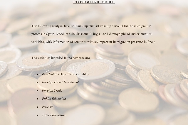 The object of this project is focused in finding out the type of variables that could affect and influence the immigration process in Spain. The countries selected are, Algeria, Bulgary, Bolivia, Colombia, China, Ecuador, Morocco, Senegal, Peru, Romania, for the period between 1997-2005.