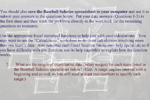 You should also save the Baseball Salaries spreadsheet to your computer and use it to submit your answers to the questions below. Put your data answers (Questions 1-3) in the first sheet and then work the problems directly in the workbook for the remaining questions on measures.