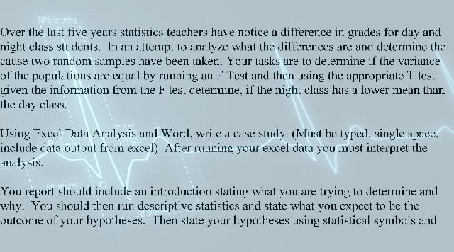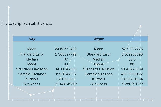 Over the last five years statistics teachers have notice a difference in grades for day and night class students. In an attempt to analyze what the differences are and determine the cause two random samples have been taken. Your tasks are to determine if the variance of the populations are equal by running an F Test and then using the appropriate T test given the information from the F test determine, if the night class has a lower mean than the day class.