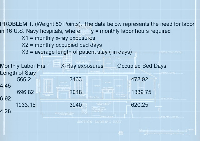 PROBLEM 1. (Weight 50 Points). The data below represents the need for labor in 16 U.S. Navy hospitals, where: y = monthly labor hours required