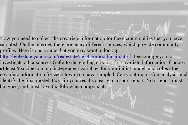 Now you need to collect the covariate information for these communities that you have sampled. On the internet, there are many different sources, which provide community profiles. Here is one source that you may want to lookup: http://realestate.yahoo.com/realestate/neighborhood/main.html I encourage you to investigate other sources (refer to the grading criteria) for covariate information. Choose at least 9 socioeconomic independent variables for your initial model, and collect the covariate information for each town you have sampled. Carry out regression analysis, and identify the final model. Explain your results clearly in a short report. Your report must be typed, and must have the following components: