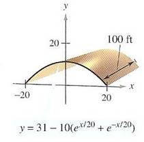 Question: A barn is 100 feet long and 40 feet wide. A cross section of the barn’s roof is the inverted caternary \(y\quad =\quad 31\quad -\quad 10\,\left( {{e}^{{}^{\,x}\!\!\diagup\!\!{}_{20}\;}}\quad +\quad {{e}^{{}^{\,-\,x}\!\!\diagup\!\!{}_{20}\;}} \right)\) . Find the number of square feet of roofing on the barn. See the figure.