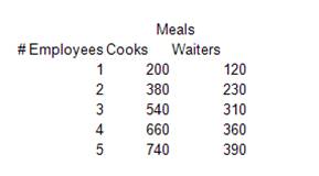 Question: A restaurant hires cooks and waiters. Cooks earn $10 an hour; waiters earn $5 an hour. The manager, who wants to maximize the number of meals served given a fixed payroll (budget) of $45 per hour, expects the following from cooks and waiters:
