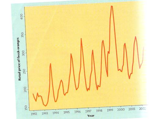 Figure 1.13 (below) is a time plot of the average price of fresh oranges each month during the decad
