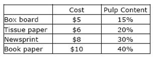 Question: Question 5: A paper recycling plant processes box board, tissue paper, newsprint, and book paper into pulp that can be used to produce three grades of recycled paper (grades 1, 2, and 3). The prices per ton and the pulp contents of the four inputs are shown in the table below. Two methods, de-inking and asphalt dispersion, can be used to process the four inputs into pulp. It costs $20 to de-ink a ton of any input. The process of deinking removes 10 percent of the input's pulp, leaving 90% of the original pulp. It costs $15 to apply asphalt dispersion to a ton of material. The asphalt dispersion process removes 20% of the input's pulp. At most 3000 tons of input can be run through the asphalt dispersion process or the de-inking process. Grade 1 paper can only be produced with newsprint or book paper pulp; grade 2 paper, only with book paper, tissue paper, or box board pulp; and grade 3 paper, only with newsprint, tissue paper, or box board pulp. To meet its current demands, the company needs 500 tons of pulp for grade 1 paper, 500 tons of pulp for grade 2 paper, and 600 tons of pulp for grade 3 paper. Formulate an LP to minimize the cost of meeting the demands for pulp.