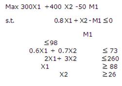 Each day, Carco can rent up to 98 type 1 machines at a cost of $50 per machine. At present, the company has 73 type 2 machines and 260 tons of steel available. Marketing considerations dictate that at least 88 cars and at least 26 trucks be produced. Let
