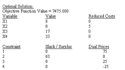 Question: The linear programming problem whose output follows is used to determine how many bottles of fire red nail polish (x1), bright red nail polish (x2), basil green nail polish(x3), and basic pink nail polish(x4) a beauty salon should stock. The objective function measures profit; it is assumed that every piece stocked will be sold. Constraint 1 measures display space in units, constraint 2 measures time to set up the display in minutes. Note that green nail polish does not require any time to prepare its display. Constraints 3 and 4 are marketing restrictions. Constraint 3 indicates that the maximum demand for fire red and green polish is 25 bottles, while constraint 4 specifies that the minimum demand for bright red, green and pink nail polish bottles combined is at least 50 bottles.