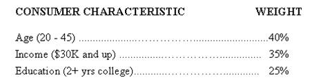 Preliminary market research studies made my the agency have shown that the desired market for electric shavers is composed of men who are 20 to 45 years of age, who have incomes of $30,000 and up, and who have two or more years of college education. The researchers have decided to weigh these factors as follows: