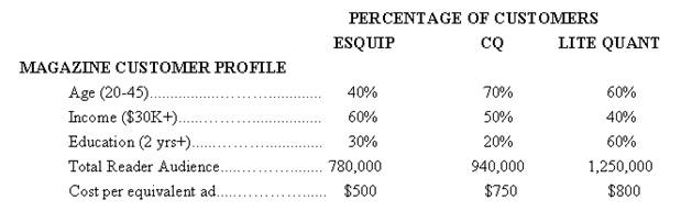 In researching available magazine reader profiles, three magazines in particular were noted to have the highest percentages of readers in each of the three categories. The magazines were: Esquip, CQ, and Lite Quant.