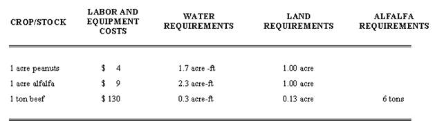He estimates that beef will sell for $650 per ton, and a mature beef cow should produce a ton of beef. Peanuts will sell for $3.25 per bushel. His best guess is that he will be able to sell alfalfa for $64 per ton if he has excess alfalfa over what his cattle stocks require, but if he needs more alfalfa to feed his cattle than he can raise, then he will have to pay $66 per ton to get the alfalfa brought in.