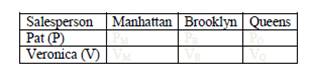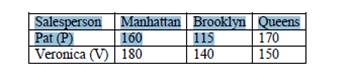 a. Formulate the problem of determining the fraction of time that each salesperson will spend selling in each of the three boroughs as a linear program. Specify the objective function and all relevant constraints (Hint: At least five constraints are needed: one for each salesperson and one for each borough).