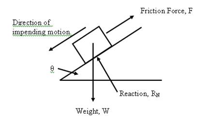 Question: A body of weight W on the point of slipping down a plane inclined at angle θ to the horizontal is shown below. The component of weight down the slope is Wsinθ and that normal to the slope is Wcosθ. The friction force F acts up the plane to oppose the motion. Find the coefficient of friction in terms of the angle θ.