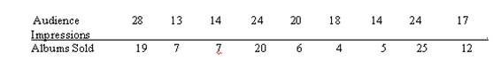Question: Song Audience and Sales. Find the best predicted number of albums sold for a song with 20 (hundred million) audience impressions. (In the table below, audience impressions are in hundred of millions and the numbers of albums sold are in the hundreds of thousands).