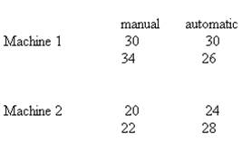 Question: A manufacturing company designed a factorial experiment to determine whether the number of defective parts produced by two machines differed and if the number of defective pares produced also depended on whether the raw material needed by each machine was loaded manually or by an automatic feed system. The following data give the numbers of defective parts produced. Use a=.05 to test for any significant effect due to machine, loading system and interaction.