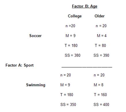 Question: Most sports injuries are immediate and obvious, like a broken leg. However, some can be more subtle, like the neurological damage that may occur when soccer players repeatedly head a soccer ball. To examine long-term effects of repeated heading, Downs and Abwender (2002) examined two different age groups of soccer players and swimmers. The dependent variable was performance on a conceptual thinking task. Following are hypothetical data, similar to the research results.