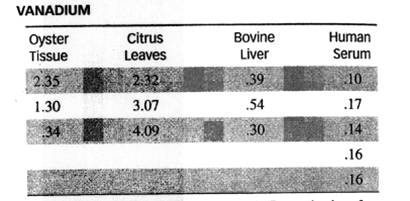 table gives the quantities of V (measured in nanograms per gram) in dried samples of oyster tissue, citrus leaves, bovine liver, and human serum.