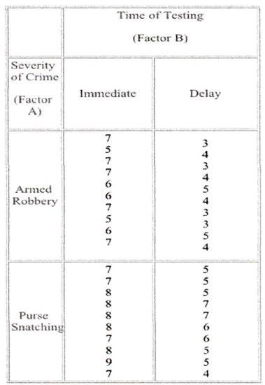 Question: We are examining the results of a study of eye-witness testimony. The investigators wish to know whether recall of important information is influenced by the severity of the criMeand the amount of time that passes before the witness is asked to recall important events. The study is described below. The first independent variable is severity of the crime. A videotape is made of a man stealing a woman's purse in an uncrowded clothing store. A second videotape is made, using the same actors, of a man using a gun to rob the cash register of the same clothing store. In this scenario, the woman is a sales clerk behind the cash register and there are two people standing at the counter. The second independent variable is time to recall. Subjects are asked to view the videotape and to imagine that they are at the crime scene. In the "immediate" condition, subjects are asked a series of questions about the crime within 10 minutes of viewing the videotape. In the