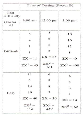Question: Students often complain that having final exams at scheduled times that are different from regular class sessions disrupts their circadian rhythms and affects their performance. You suspect that this might be so and that the impact would be greatest for more difficult exams. To test this, you conduct a 2 x 3 between-subjects experiment in which difficulty level and time of testing are varied for a sample of students who are taking final exams at "different" times. Using the data presented below, test whether performance depends on time of day and difficulty level of the exam. Perform the appropriate analysis using SPSS. Please write up the results as you would in a scientific paper. For any significant main effects, please report the effect size. Please turn in the relevant portions of your SPSS output. (12 points)