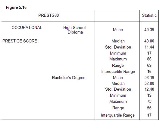 Question: Occupational prestige is a statistic developed by sociologists to measure the status of one's occupation. Occupational prestige is also a component of what sociologists call socioeconomic status, a composite measure of one's status in society. On average, people with more education tend to have higher occupational prestige than people with less education. We investigate this using me 2002 GSS variable PRESTG80 and the Explore procedure to generate the selected SPSS output shown in Figure 5.16.