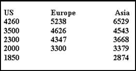 Lengths (in feet) of a random sample of suspension bridges in the US, Europe, and Asia are shown. At