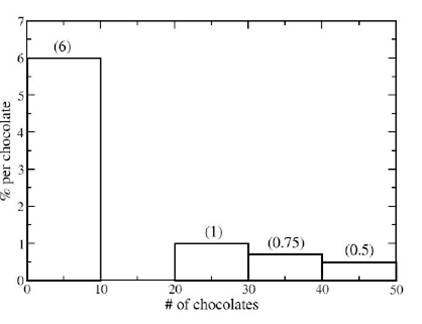 g) If everyone that said they were eating 30 or more chocolates per week, quit eating chocolates entirely, the 30-40 and 40 -50 blocks would disappear and the 0 -10 block would increase in height. How high would the new 0 -10 block be?