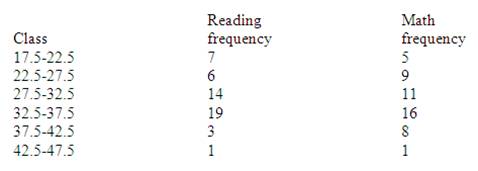Question: Making the Grade. The frequency distributions shown indicate the percentages of public school students in fourth-grade reading and mathematics who performed at or above the required proficiency levels for the 50 states in the United States. Draw histograms for each, and decide if there is any difference in the performance of the students in the subjects.
