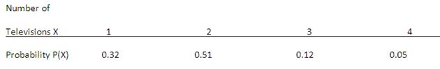 Question: Number of Televisions per Household. A study conducted by a TV station showed the number of televisions per household and the corresponding probabilities for each. Find the mean, variance, and standard deviation.