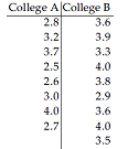 Independent simple random samples of 8 students from college A and 9 students from college B yielded the following GPAs.