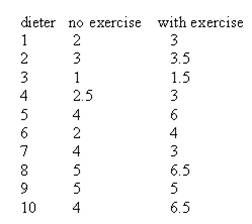 Question: Group of dieters started exercise program. Is there a difference in the weight loss without and with exercise at .05 level. Use paired sample sign test. State hypotheses and identify claim, find critical value(s), compute test value, make decision, summarize results.