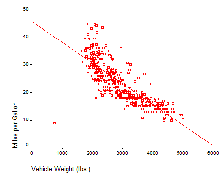 Question: The following scatter plot was created for two characteristics of a sample of automobiles, weight and miles per gallon. After looking at the graph, what can you conclude about the relationship between the two characteristics?