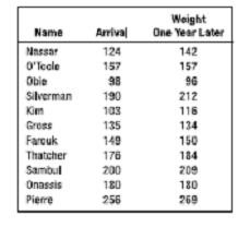 weights upon arrival on campus with weights one year later. It is suspected that the richer American food will cause an increase in weights. Use the .01 significance level. A random sample of 11 international students is chosen for the study. What is your conclusion?