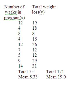 Question: Find the correlation between the number of weeks spent in a weight loss program by participants(x) and the weight lost(y in lbs) as given in table below