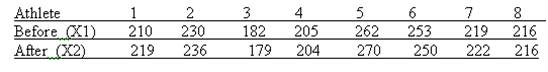 Question: A phys. education director claims that a special vitamin can increase a weight lifter' strength. 8 athletes are selected and given a strength test on a std. bench press. After two weeks of normal training supplemented by a std. dose of this vitamin, they are tested again. The results (in lbs. bench pressed) are shown below. At a =0.05, is there sufficient evidence to support the p.e. director's claim?