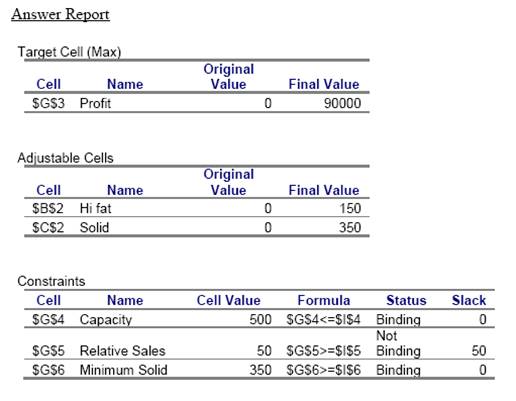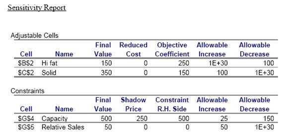 A dairy products firm sells two types of products: “Hi-fat” and “Solid”. The profit for Hi-fat and Solid are $250 and $150 per unit respectively. The firm has a total production capacity of 500 units per week regardless of product type. Electronic sales records show that each week, the firm never sells more than one-half as many Hi-fat units as it does Solid units. The firm must produce at least 350 units of Solid per week as per an agreement with its farmer suppliers. The firm wants to find out how many units of each type of product it should make per week in order to maximise profit The Answer Report and the Sensitivity Report from Excel Solver are shown below.