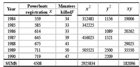 Question: Manatees are large sea creatures that live in the shallow water along the coast of Florida. Many manatees are injured or killed each year by powerboats. Here are the data on manatees killed and powerboat registration (in thousands of boats) in Florida for the period 1984 to 1990.