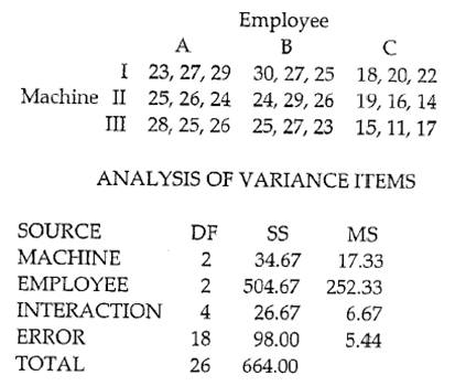 Question: A manager records the production output of three employees who each work on three different machines for three different days. The sample results are given below and the Minitab results follow.