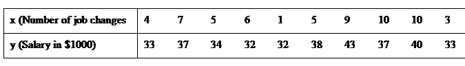 A sociologist is interested in the relation between x = number of job changes and y = annual salary (in thousands of dollars) for people living in the Nashville area. A random sample of 10 people employed in Nashville provided the following information:
