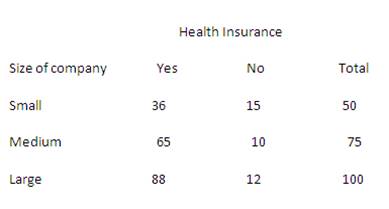 Question: With double digit annual percentage increases in the cost of health insurance, more and more workers are likely to lack health insurance coverage. The following sample data provide a comparison of workers with and without health insurance coverage for small. Medium and large companies. Sample data are reported for 50 employees of small companies, 75 employees of medium companies and 100 employees of large companies