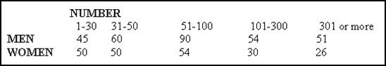 Question: Some 300 men and 210 women were asked about how many ads in all media they think they saw or heard during one day. The results are shown:
