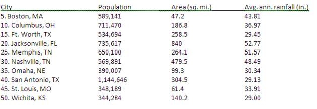Question: Rainfall in U.S. Cities. Select a sample of 10 cities by the systematic method. Compare the sample means of the population, area, and average annual rainfall. Compare to the population means.