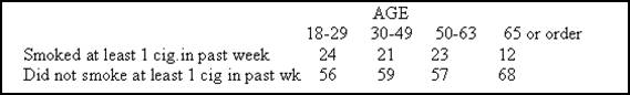 Question: Suppose researcher wants to investigate whether proportion of smokers within different age groups is the same. He divides the American population into 4 age groups. Within each age group, he surveys 80 individuals and asks, "have you smoked at lease one cigarette in the past week?". Test at the .01 level. State hypotheses and identify claim, find critical value(s), compute test value, make decision, summarize results. Results of survey are as follows: