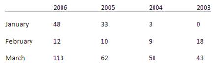 Question: Tornadoes. According to records from the Storm Prediction Center, the following numbers of tornadoes occurred in the first quarter of each of the years 2003-2006. Is there sufficient evidence to conclude that a relationship exists between the month and year in which the tornadoes occurred? Use a = 0.05.