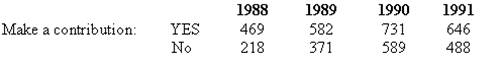 Using a 5% level of significance, test the null hypothesis that the percentage of graduates who contributed money is the same across all these graduating classes.